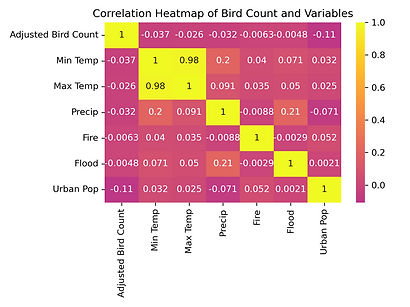 Based on the heatmap to the right, we can see there are no very strong relationships between any of the features and the Adjusted Bird Count, which is our predicted variable. The strongest relationship is the Urban Population variable which is a number between 1 and 5 that indicates how urban a county is. We can also see that the Min Temp and Max Temp variables are very highly correlated, which indicates we should not use both in our model but instead choose one or use an average monthly temperature value instead.